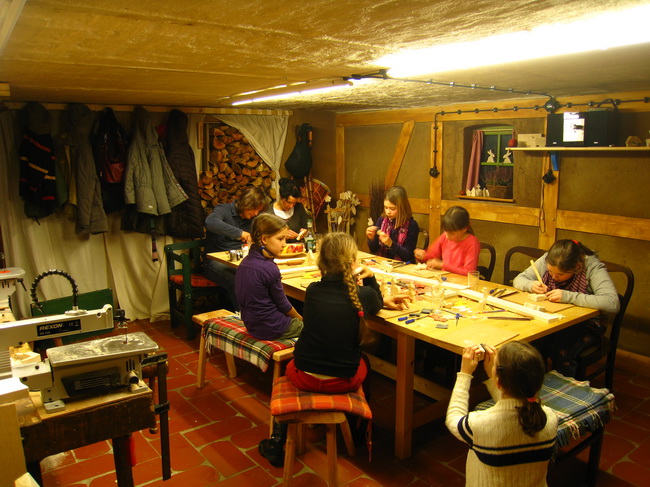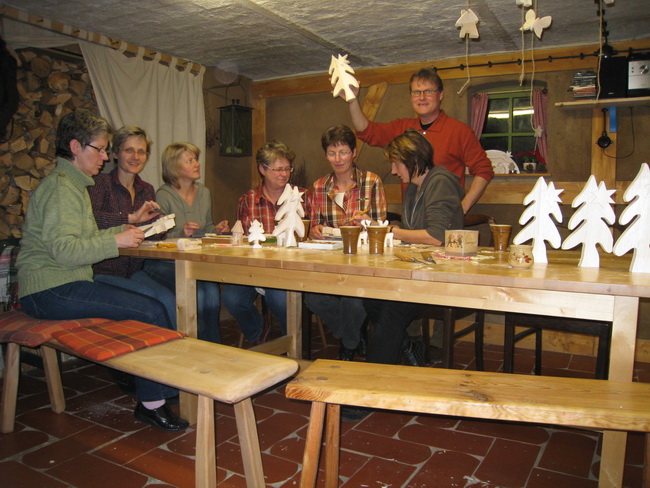 Wir plaudern und arbeiten am großen Basteltisch in der Werkstatt bei prasselndem Holzfeuer oder bei schönem Wetter auf dem Hof mit Storchenblick.